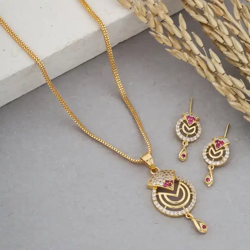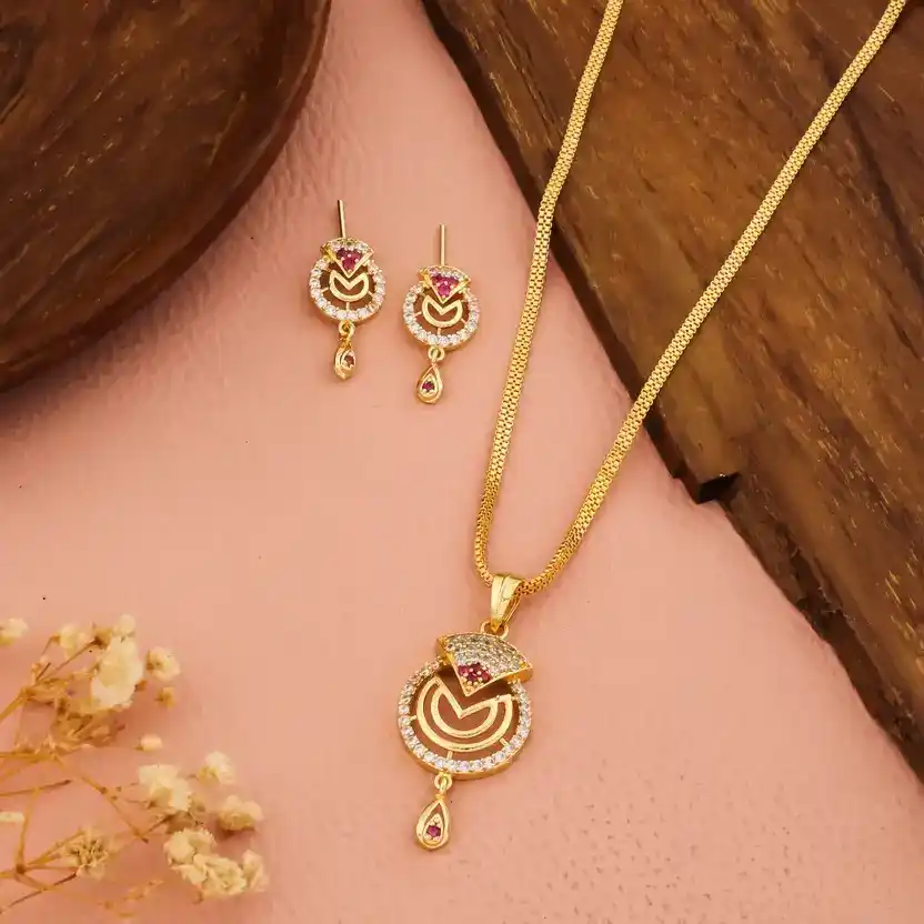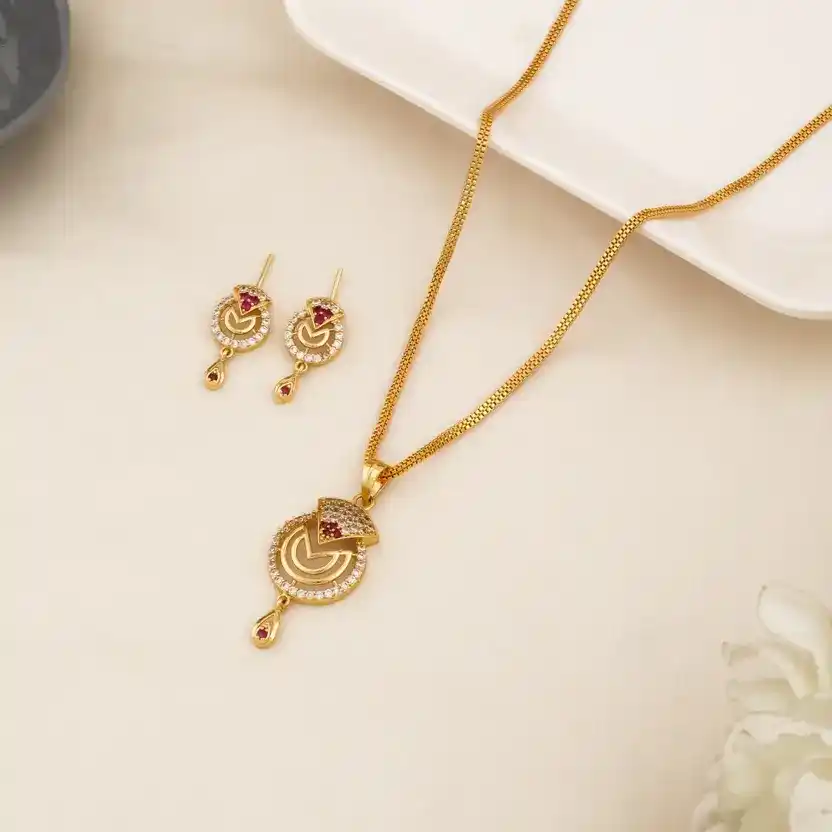 Gold-Plated Ruby & CZ Studded Pendant Set with Chain