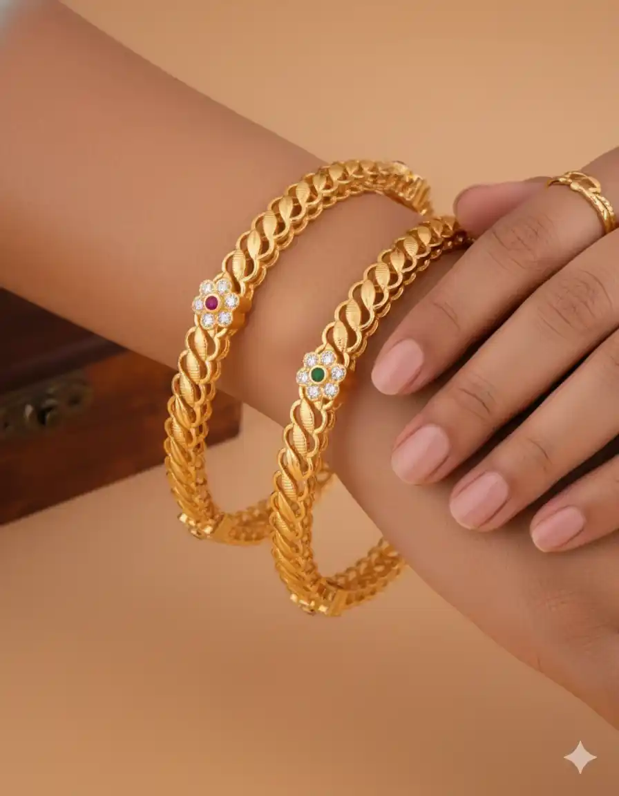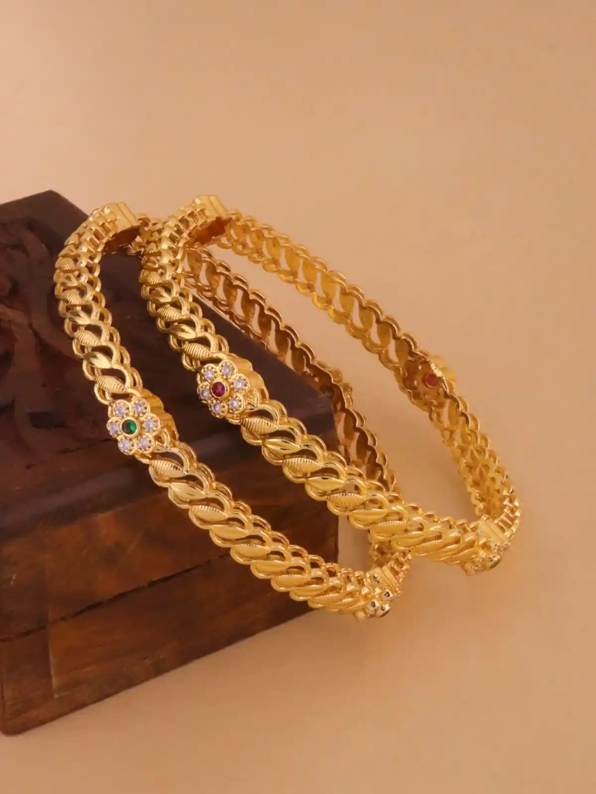 Royal Bloom Gold Bangles – Elegant Floral Charm with Gemstone Accents