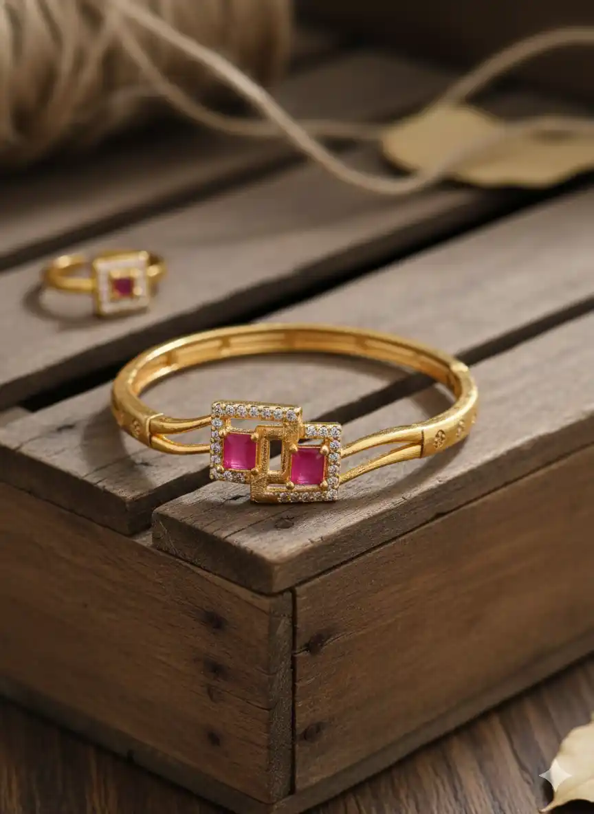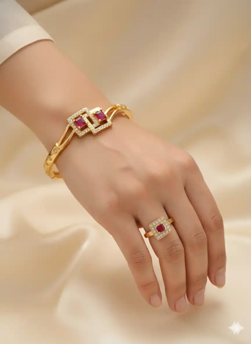 micro gold plated ad diamond studed fancy square bracelet with adjustable ring